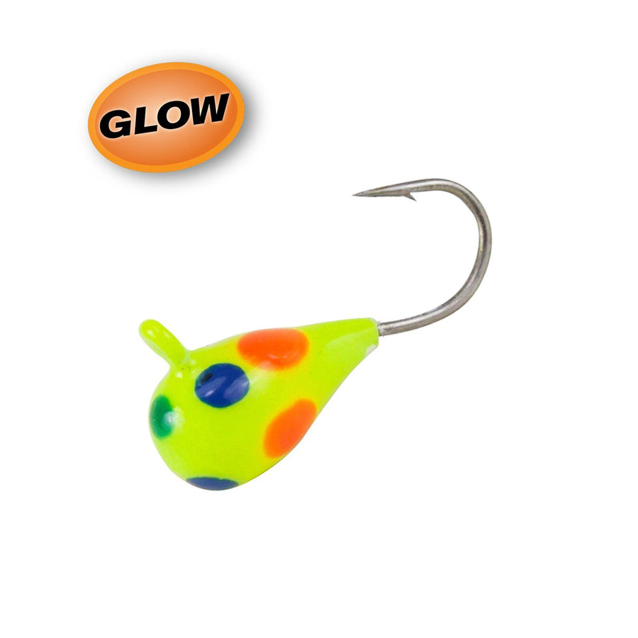 Same jig. Bigger, wider-gaped hook. When the Drop pounded onto the scene, the ice fishing world fell in love with it. You already know the tungsten craftsmanship, killer colors and angled hook orientation for better hooking percentage. But sometimes the hook itself can be a bit on the small side when you want to bulk up with waxies, maggots or a Maki Plastic. We needed Drop jigs with bigger hooks, so we made them.