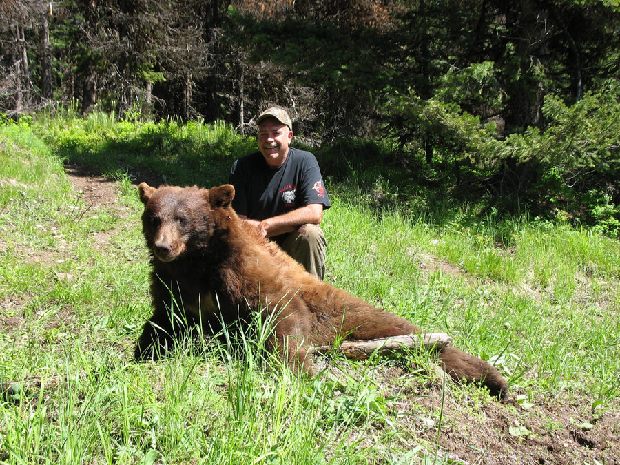 Spring bear hunts are 6 day hunts from the lodge, you will be hunting 5 day over bait. This is a good hunt for husband & wife, fathers & sons or daughters. The baits are placed out starting May 1st. We run these hunts from about May 15th to June 30th. This is a very productive method and easy on the hunter. We have 24 baits sites and check to see which ones have been hit and set up on these. We use ground and tree blinds over the baits. The bait sites are a short walk from 4X4 access roads. This is an effective method with rifle, bow or pistol. This hunt gives you the luxury of returning to the lodge each day for a great home cooked meal, soft bed and soak in our hot tub. The cost for a non-resident license is $185.00. We hunt in 2 different zones the Selway and Elk City zones. The Selway and Elk City zone hunts are in a reduced bear tag unit the bear tag cost is $41.75. It is also a 2 bear area and a second tag can be bought for $41.75. We charge $1,000.00 extra to hunt a second bear after you have shot you first bear. We have a high percentage of color phase bears, 60% of the bears we kill are chocolate, Cinnamon or blond, the balance are black.